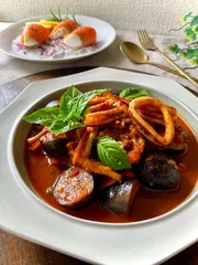 茄子とイカのトマト煮 見た目、少しカレーっぽくも見えますが…茄子とイカをトマト味の野菜ジュースで煮ました😅元々そのままで飲んでも美味しいから、塩胡椒で味を調えるだけ💧にんにく、玉ねぎを炒めてトマトソースを作っから、レンチンした茄子、イカを仕上げにサッと煮たので…イカがやわらかくて美味しかった🎵 トマト系のお料理