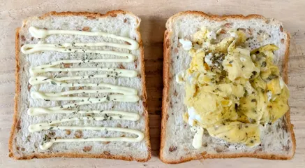 レンチンバジル玉子サンド🫔 マグカップに卵2個とバジルと鶏ガラスープの素と豆乳を投入してレンチン1分x3回しての簡単サンドイッチ😁