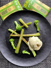 ウフマヨ ブロッコリー茎ソテー ブロッコリーの茎部分を切り取ってピーラーで皮を取る。フラパンにオリーブオイルを入れ塩胡椒でソテーする。9分茹でて半熟卵にする。マヨネーズにバジルを加えて良く混ぜ合わせて卵にかける。盛り付けたら全体にオレガノを振って完成。少しスジが残るけどアスパラガスのようでブロッコリーの茎も付け合せになります。マヨ
