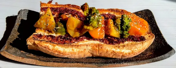ベジカレーバインミー🥖 チャツネをぬったフランスパンをトーストして、朝のベジカレーの野菜たちを乗せてはさんで、ガブリッ😁