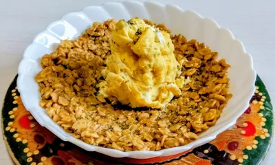 だし巻かない玉子おっ立てオートミールドライカレー✌️😁 マグカップに卵2個、マヨ、バジル、鶏ガラスープの素、豆乳を入れ撹拌し600wで1分、混ぜ混ぜしてさらに1分。出来上がった玉子はドライカレーの中央へ😆