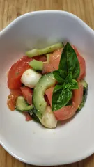 カプレーゼアレンジ 仲良しのおばあちゃんのきゅうりは巨大に成長してたので種をとってザク切りにしてカプレーゼに加えてみましたシャキシャキが加わって、おいしかったですモツァレラチーズはバラ冷凍になっててムダなく使えて便利です😆コストコサイズですが〰