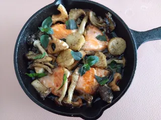 秋鮭ときのこのアヒージョ アヒージョシーズニングを使用してアヒージョを作りました 秋鮭、シメジ、エリンギ、レンコン、オリーブオイル、シーズニングアヒージョ スキレットに入れて火が通ったら家庭菜園で収穫したオレガノ、バジルをちぎってトッピングしました 簡単に作れてお味は本格的で美味しく頂きました