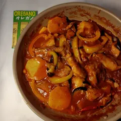 豚トロの野菜トマト煮込み 豚トロに塩、ブラックペッパー、片栗粉を漬けて、いろんな野菜と一緒に炒め、トマトピューレとローレルと一緒にコンソメで煮込みましたオレガノでアクセントをつけて