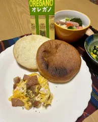 スクランブルエッグの朝ごはん 1/10(金)の朝ごはんは、、珍しくパンです🥐スクランブルエッグとミルクスープと一緒に。オレガノを振ったら香りも色も良くなりました☘️