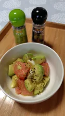 カプレーゼ⋯風 今日は真面目に母が食べやすいよう小さく切りました。トマトも皮を剥いて軽く塩ふって、粗挽き黒胡椒、バジルがなかったのでオレガノ、レモンをぎゅ~(庭のレモンもそろそろ終わる)オリーブオイル加えてザクザク混ぜる🐮モツァレラチーズは白玉だんごみたいなサイズの冷凍がコ◯◯コにあるの1kg入りだけど💦保存効