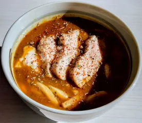 普通にカレーうどん😗 コシのある太めの讃岐も好んでチョイスしてみるが……やっぱ器周りにカレーが飛び散ってしまうよねん😅