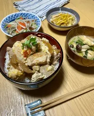 親子丼 夕ご飯に親子丼を作りました。大人は七味をかけてピリッと。甘さの中に刺激が美味しい😊