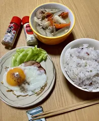 豚汁の朝ごはん ご近所さんから里芋をいただいたので豚汁を作りました。豚汁には七味唐辛子を、目玉焼きにはコショーをかけていただきました。