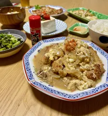 カツの夕ご飯 1/30(木)の夕ご飯は、、 カツの卵とじソースカツ冷奴お味噌汁大根の葉炒めご飯エイヒレ でした。居酒屋みたい🏮エイヒレには味噌マヨ七味、カツの卵とじにも七味。ごちそうさまでした✨