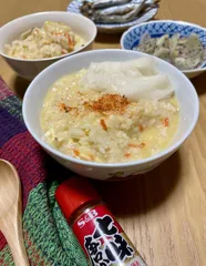 卵雑炊の朝ごはん 昨日は夜は鍋でした。食べる前に少し取り分けておいて、今朝はご飯を入れて卵でとじて、あったか卵雑炊に。寒い朝ですがあったまりました。大人は七味をピリッと効かせて。