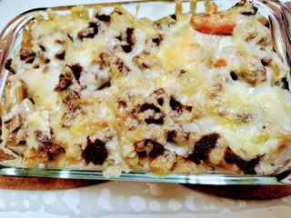 米粉グラタン♪ 米粉のペンネグラタン、作りました! シメジを炒めたので旨味が出て美味しくなりました。