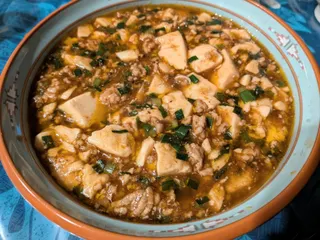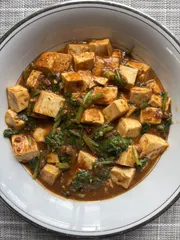 XO醬香るほうれん草麻婆豆腐 木綿豆腐1丁、ネギ適量、鶏がらスープ200ミリ、豆板醤適量、ニンニク1片、ラー油適量、一味唐辛子適量、花椒適量、XO醬小さじ2、甜麺醤適量、醤油適量、ほうれん草2束、豚ひき肉70g、片栗粉適量切った木綿豆腐を沸騰したお湯で2分湯通ししてザルにあける。鍋に油、ニンニクの香りが出たら豆板醤、甜麺醤、一味