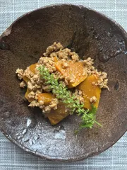 エビ出汁と花椒香るカボチャ煮 カボチャ1/8、顆粒エビ出汁大さじ1、水400ミリ、醤油適量、鶏胸ひき肉100g、塩適量、花椒適量、片栗粉適量水に顆粒エビ出汁を入れた所へカボチャを加えて中火から弱火で15分煮る。15分経ったら火を止めて粗熱を取る。フライパンに油、鶏胸ひき肉に塩、醤油を加えて炒める。フライパンにカボチャ、花椒を加え