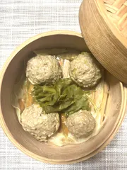 生椎茸肉詰めせいろ蒸し 豚ひき肉70g、塩胡椒適量、花椒適量、擦り生姜小さじ1、細ネギ1本、生椎茸4本、青梗菜適量、オイスターソース小さじ2、醤油適量、片栗粉適量、顆粒鶏がら出汁小さじ1〜2豚ひき肉に塩胡椒、生姜、ネギ、山椒、オイスターソース、醤油、椎茸軸を加え良く混ぜ合わせる。椎茸に片栗粉をまぶして豚ひき肉をのせる。せい