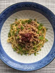 汁無し担々麺 中華麺100g、豚ひき肉60g、万能ネギ適量、粉唐辛子適量、塩胡椒適量、鹿児島甘醤油適量、XO醬小さじ半分、胡麻油適量、オイスターソース適量、ネギラー油適量。フライパンに油、豚ひき肉を塩胡椒して炒め、火が入ってから粉唐辛子、XO醬、甘醤油を加えて炒める。茹でた中華麺を湯切りしてボールの中で胡麻油、オ
