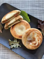 チャプチェホットック 強力粉100g、米粉30g、ベーキングパウダー小さじ半分〜1、タンミョン100g、塩胡椒適量、コチジャン適量、サムジャン適量、醤油適量、ニンジン適量、万能ネギ適量、胡麻油適量強力粉と米粉、ベーキングパウダーに水を加えながら練り合わせる。ボールに入れ、ラップをして少し休ませる。もどしたタンミョンをフラ
