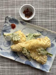 はもと春菊の天ぷら はも1尾、塩麹パウダー適量、花椒適量、小麦粉適量、水適量、粉唐辛子適量、海老醬適量、春菊適量はも(骨切り済み)に塩麹パウダーと胡椒をふりかけて10分位おく。小麦粉を水で溶いてはもに付けて天ぷらにする。春菊にも衣を付けて天ぷらにする。揚げ終わったら塩をふる。盛り付けたら粉唐辛子と海老醬を添える。唐辛子