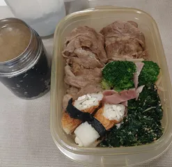 1.牛肉を醤油、砂糖、鶏ガラスープの素、ヤマサYummyたれで弱火で煮て、半生で火を止める。2.ご飯にも、S&B山葵、醤油、砂糖、Yummyたれで少し味付け。ラップで、ご飯を握り、焼いた牛肉を2巻きする。