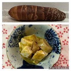 京芋カマン 無調整豆乳に麦味噌、ターメリック、クミンを入れて少し煮詰め、ねっとり系食材と和えました。 京芋は皮を剥いても、手は痒くならなかったです。