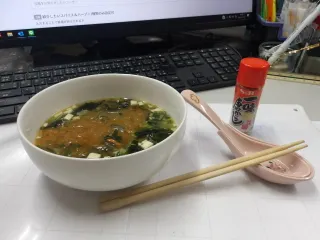 会社の夜食です。 小腹が空いたので・・でもスナック系は 夕食の勢いがなくなる・・・今日は記念日でもありモリモリ 美味しく食べないと 家神様の心象が悪くなると 味噌汁に春雨と具材を足して 食べています~ (^_-)-☆レトルト サマサマですね。でも、出来るだけ早く帰ります (^_-)-☆ &nbs