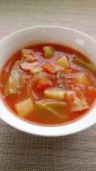 ミネストローネスープ エスビー公式レシピ、ミネストローネスースープを参考に作りました。マジックソルトと野菜がとっても相性がよく美味しいスープになりました♪トッピングにドライパセリを振りかけてお洒落な見栄えに✨