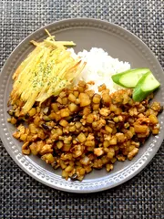 茄子とジャガイモを細かく切って、ニンニク、カレー粉、ナツメグ、塩胡椒、醤油で炒めでご飯にのせるだけ!具材の食感とピリ辛を楽しめるワンプレート!