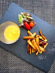 さつま芋のホワイトクリームカレーディップ ホワイトクリームにカレー粉を混ぜ合わせて、素揚げしたさつま芋をディップ!簡単おやつ&おつまみに最適!