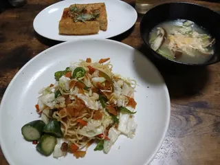 ~レシピ名〇〇〇~調理時間:7分■材料(1人分)福神漬け50gピーマン1個半分ニンニク一掛けキャベツ60g鶏ガラスープの素小さじ3醤油 少々塩胡椒 少々 ■作り方【1】野菜、ニンニクを切る【2】フライパンにサラダ油、スライスニンニクを入れ香りが立ったら、水、焼きそばを炒める【3】福神漬け、