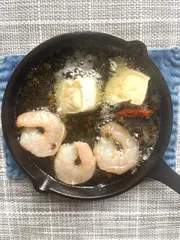 オリーブオイル適量、青山椒適量、唐辛子1本、剥きエビ3尾、カマンベールチーズ適量、スモークソルト適量スキレットにオリーブオイル、青山椒、唐辛子を入れて温める。エビに火が入って香りが出てきたら、火を止めてカマンベールチーズとスモークソルト。スモークソルトと青山椒の爽やかな香り、溶けたカマンベールチーズ