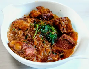 ルンダン風味のカレー春雨🥵 豚軟骨を12時間スロークック❗️しっかり煮込んで、むせるほどに辛く仕上がりました🔥