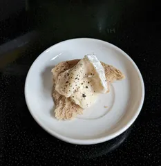カマンベールチーズにひきたてブラックペッパー。これで、食べやすくなりました。(同じ白カビ系ブリーチーズのほうが苦みが少なくておいしいなぁ・・・) 白いお皿に白いチーズでは写りが悪いかと思って間に、パンを敷きました。