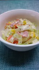 エスビー公式レシピ、ふんわりわさびが香るコールスローサラダを参考に作りました。わさびとマヨネーズの相性がバッチリで、美味しいコールスローサラダが出来ました✨