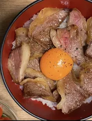 ステたま丼 牛肉をたっぷりのせたどんぶり♪最後に黄身は真ん中に… ブラックペッパーで味付けします!