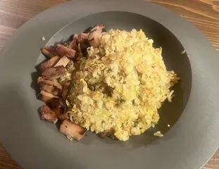 別添えベーコン炒飯 大きめベーコンを使用。チャーハンのご飯の量と調整して食べれるように、別添えにしてみました♪ チャーハンを炒める時、ベーコンを炒める時、どちらもしっかりブラックペッパーで味付けしています。