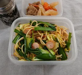 ニラ粗挽きソーセージキャベツ小松菜の 唐辛子パスタ 今日のお弁当🍱滋養レシピニラ粗挽きソーセージキャベツ小松菜の粗挽き唐辛子パスタ蓮根人参おかかの黒胡麻金平鱈大根人参煮鶏ガラスープ 甘いキャベツと小松菜にニラを合わせ身体を冷やすパスタに温め効果のある唐辛子やニンニクスパイスを入れしました🐦冬の根野菜も合わせ食感を出しました。