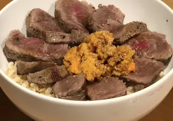 うにステーキ丼 美味しいうにを瓶詰めでいただいた時。初日はうにだけで堪能したので、その次からうにとステーキを合わせてみました! ステーキと合わせるために、うに自体にもブラックペッパーで味付けしました。程よい塩味がステーキの脂身をさっぱり食べる秘訣に♪ スパイス×海鮮も色々知りたいです。