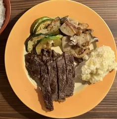 ステーキワンプレート お肉は焼いて食べやすいサイズに。 油がしっかりあるお肉なので、付け合わせを考えてお肉が飽きないようにしました。ズッキーニ、きのこ炒め、ポテサラです。全部ブラックペッパーで味付けました。きのこはプラスレモンをかけてさっぱり楽しめます♪