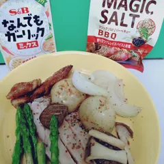 新じゃが新たまねぎがおいしい季節になりましたね スパイスに漬け込んだ鶏モモ肉おいしそうですね なんでもガーリックミックスというものがあるのね 鶏油で焼いた野菜もおいしそうですね 旬の食材春の味わいですね