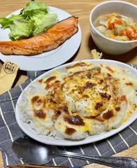 寒い〜🥶ミラノ風ドリアをイメージして作りました。真ん中には温泉卵✨(レンジで作りました)本家ミラノ風ドリアより美味しいと夫が言ってくれました🥰