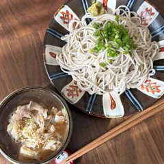 つけそば🍜 寒いけどざる蕎麦が食べたくなったので、温かいお汁でつけそばにしました😌味変で柚子胡椒も添えてピリッとスパイシーに🍊