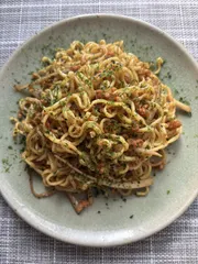 ゴボウ適量、塩胡椒適量、甘口醤油適量、大豆のお肉小さじ2、青海苔適量、中華麺9g大豆のお肉を10分くらい水に漬けて柔らかくもどす。ゴボウを細切りにしてフライパンに油を入れ、炒める。ゴボウを炒めたところに麺を入れてほぐしながら塩胡椒、大豆のお肉を加え炒める。仕上げに甘口醤油をひと回し加えて、盛り付けて