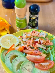 自力で解体した丸鶏のむね肉部分を使って、大好きジャークチキン🐔シーズニングをまぶして焼くだけ・:*+.\(( °ω° ))/.:+最高に美味しいです オリーブオイルには「ブラックペッパー」海老とアボカドのマリネには、「バジル」と「マジックソルト」を使って簡単に味付け