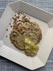 ネチ トスカーナ秋の定番栗のお菓子 栗6個、オリーブオイル適量、塩適量、キウイジャム適量、ナッツ適量鬼皮と渋皮を剥いた栗をすり鉢で粉状にする。ボールに移し、オリーブオイルと塩を加えて混ぜ合わせる。平たく伸ばしフライパンで焼く。盛り付けてナッツとキウイジャムを添える。トスカーナ州の秋の定番栗粉のお菓子。リコッタチーズをクルッと巻くのが定