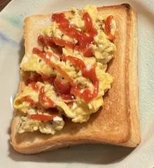 スクランブルエッグをトーストしたパンにのせます。ケチャップとブラックペッパーを好みの量入れて完成です! 時短かつ、ボリューミーな朝ごはんです。