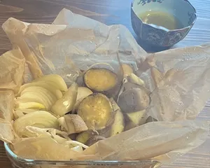 レモンオリーブと蒸し野菜 玉ねぎ、じゃがいも、さつまいもをしっかり蒸します。ブラックペッパーで味付けします。 たまに味変で使うのが、レモンとオリーブオイルを混ぜたソース。レモン汁でもいいですが、今回はレモンをそのまま絞りました。 さっぱり食べることができます!