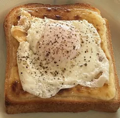 目玉焼きパン 大きな目玉焼きを乗せたパン。まずはマヨネーズをパンに塗ってトースト。目玉焼きをのせます。最後にブラックペッパーで味を整えて完成です。 写真だと、マヨネーズがチーズに見える。チーズでも美味しそう…