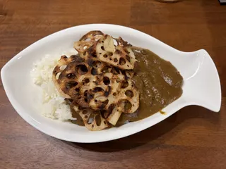 茨城のカレー♬ 野菜はすべてすりおろし、リンゴも加えました🍎とろみがでてまろやかになりました!今が旬のレンコンをグリルでチップスにして沿えました!とてもおいしかった☺️