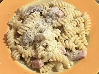 たっぷりチーズのショートパスタ パスタとベーコンときのこのパスタ。仕上げにチーズとブラックペッパーをかけました。チーズとブラックペッパーは相性抜群です。