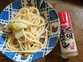 和パスタ 七味唐からしをかけようと思ったら・・・中身がしけてしまったようで、出てこない。